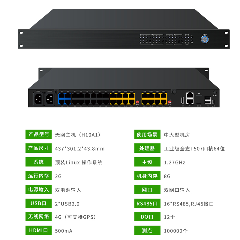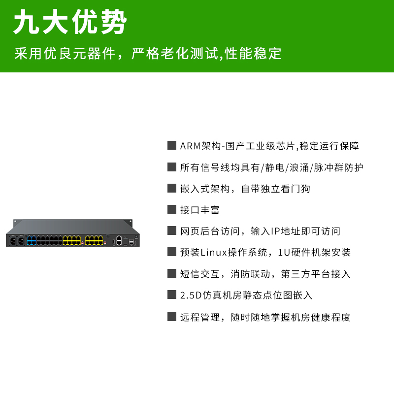 ARM架構(gòu)-國產(chǎn)工業(yè)級芯片,穩(wěn)定運行保障;所有信號線均具有靜電/浪涌/脈沖群防護(hù);嵌入式架構(gòu),自帶獨立看門狗;接口豐富,16路RS485,12路DI,4路DO,2路網(wǎng)口,2路電源;網(wǎng)頁后臺訪問,輸入IP地址即可訪問;預(yù)裝Linux操作系統(tǒng),1U硬件機架安裝;短信交互,消防聯(lián)動,第三方平臺對接,穩(wěn)定運行;2.5D仿真機房靜態(tài)點位圖嵌入;微信云告警和云平臺遠(yuǎn)程管理,隨時隨地掌握機房健康程度。