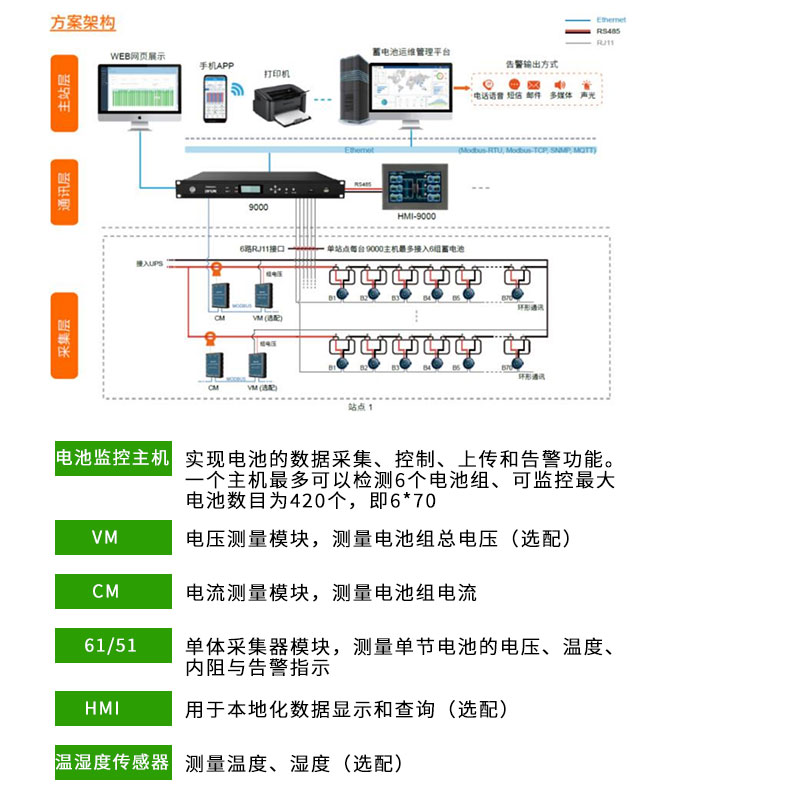實(shí)時(shí)監(jiān)測(cè)蓄電池的電壓、充放電電流、電池狀態(tài)、內(nèi)阻、溫度先進(jìn)的測(cè)量算法,無(wú)需進(jìn)行大電流放電,實(shí)現(xiàn)無(wú)損測(cè)量分體式組電壓、組電流測(cè)量模塊,可根據(jù)現(xiàn)場(chǎng)情況靈活配置單體休眠功能,實(shí)現(xiàn)低能耗先進(jìn)一鍵單體地址搜索功能快速定位機(jī)房?jī)?nèi)告警或故障的蓄電池均衡功能,蓄電池在浮充時(shí)保持電壓均衡,使電池保持最佳活性狀;多樣的告警聯(lián)動(dòng),使突發(fā)事件無(wú)所遁形靈活配置,適用于1-6組電池的監(jiān)控,最多支持420節(jié)電池的監(jiān)控支持環(huán)形通